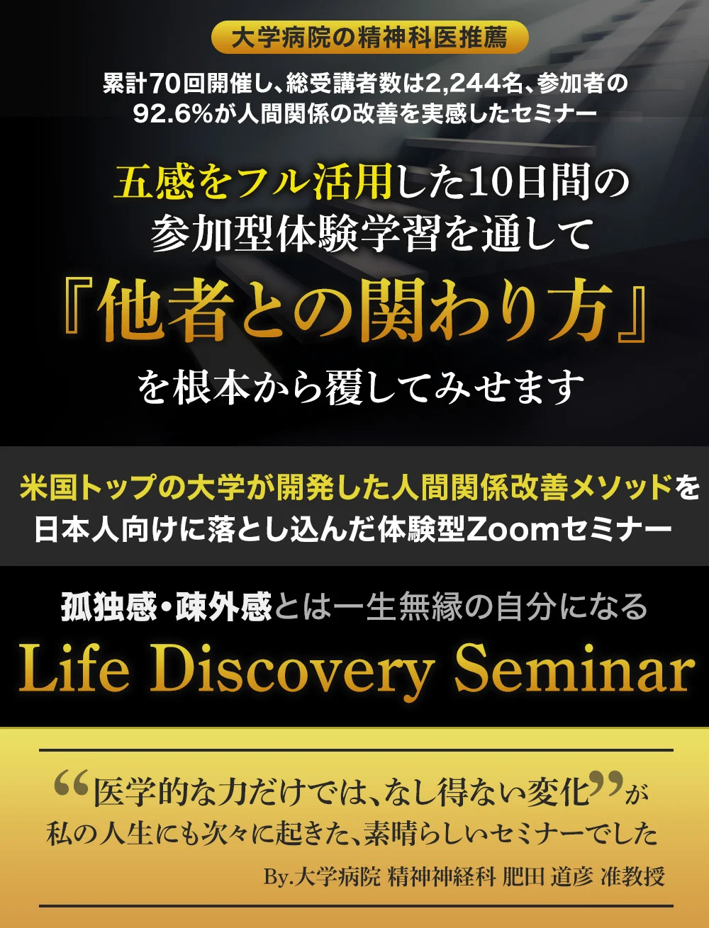 Life Discovery Seminarでは、小手先のテクニックや知識の話は一切せずに、「他者と本気で関わる体験」をワークを通して行い、実際に人生脚本を書き換えてもらいます。